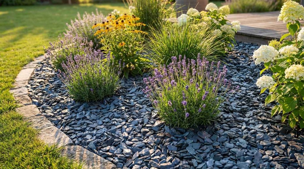 L'ardoise naturelle est particulièrement appréciée pour sa texture fine, ses teintes anthracites et ses reflets bleutés ou verdâtres selon la provenance. Elle se prête à de nombreux usages en extérieur : dallage de terrasse, habillage de muret ou création de cheminements en pas japonais. Sa très faible porosité et sa résistance au gel en font un matériau de choix pour les jardins en région froide ou humide.